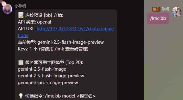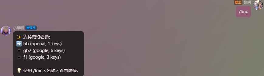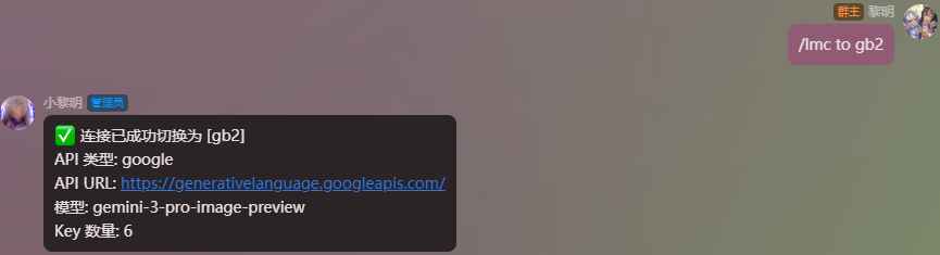 #lmc to gb2#替换你的AstrBot唤醒词 lmc是连接管理指令组 to是切换子指令 gb2替换一个存在的<连接名> |