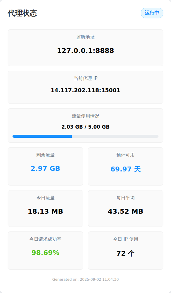 --- IP代理插件状态 --- 运行状态: ✅运行中 监听地址: 127.0.0.1:8888 当前代理IP: 123.45.67.89:1234 -------------------- 总流量限制: 10.00 GB 总使用流量: 1.25 GB 剩余流量: 8.75 GB 今日使用流量: 150.32 MB 每日平均流量 (最近3天): 200.00 MB 预计可用天数: 44.80 天 今日请求成功率: 98.50% (197/200) IP总使用量: 50 今日IP使用量: 5 -------------------- 白名单域名: gmserver-api.aki-game2.com, api.kurobbs.com